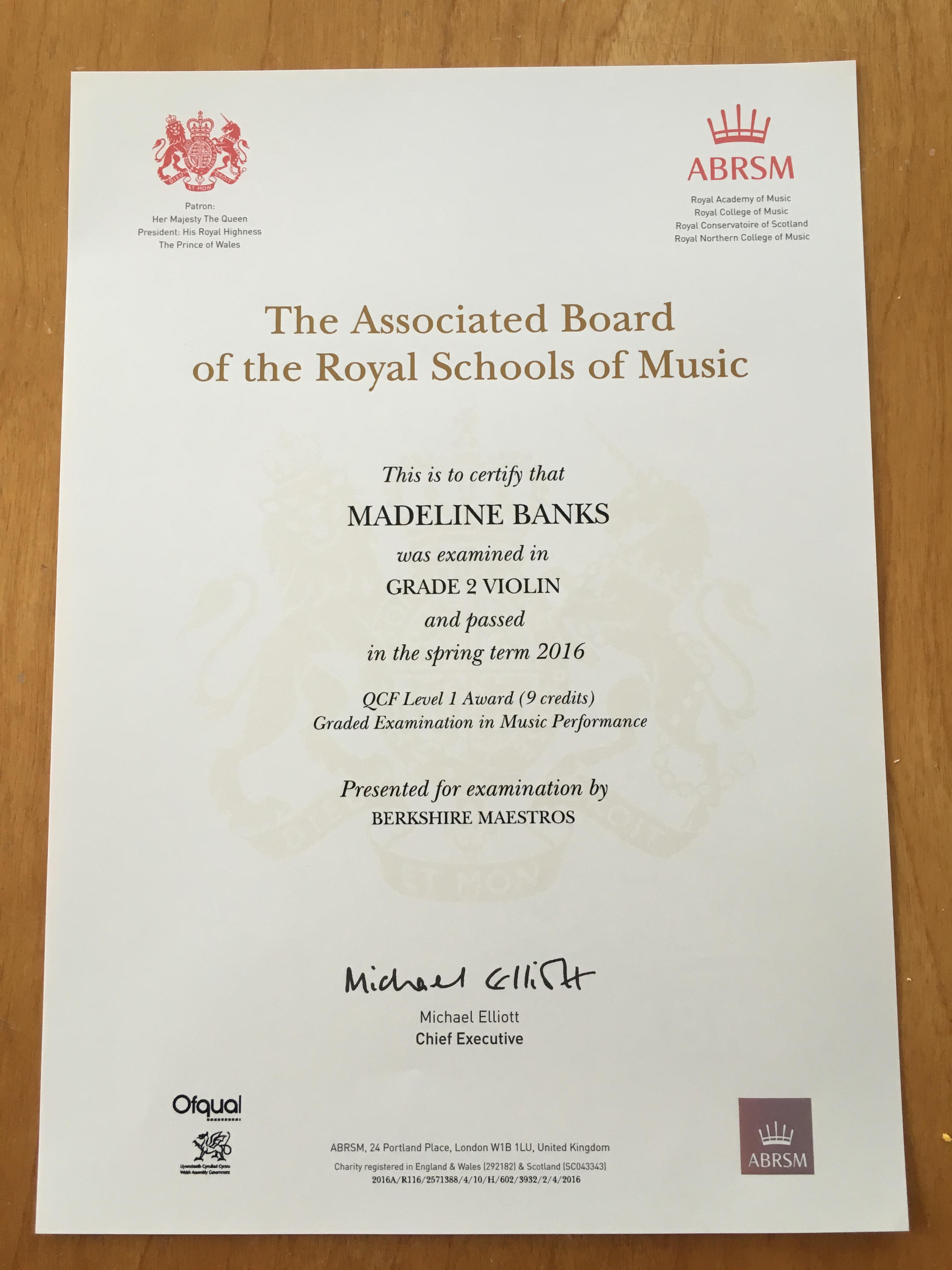 me&my: daily shots April 14: Certificate Maddie received her ABRSM Violin certificate at her lesson today. Share this: Click to share on Facebook (Opens in new window) Facebook Click to print (Opens in new window) Print Click to email a link to a friend (Opens in new window) Email Click to share on X (Opens in new window) X Like Loading...